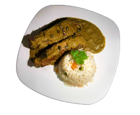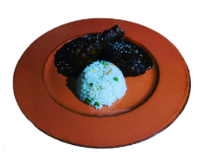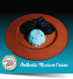 Thick and savory chili made w/ over 35 ingredients - 5 or more different types of dry peppers, spices, mix of fried nuts (peanuts, almonds & pecans), fried fruits,  chocolate, served over chicken, white rice & beans, comes w/ tortillas.